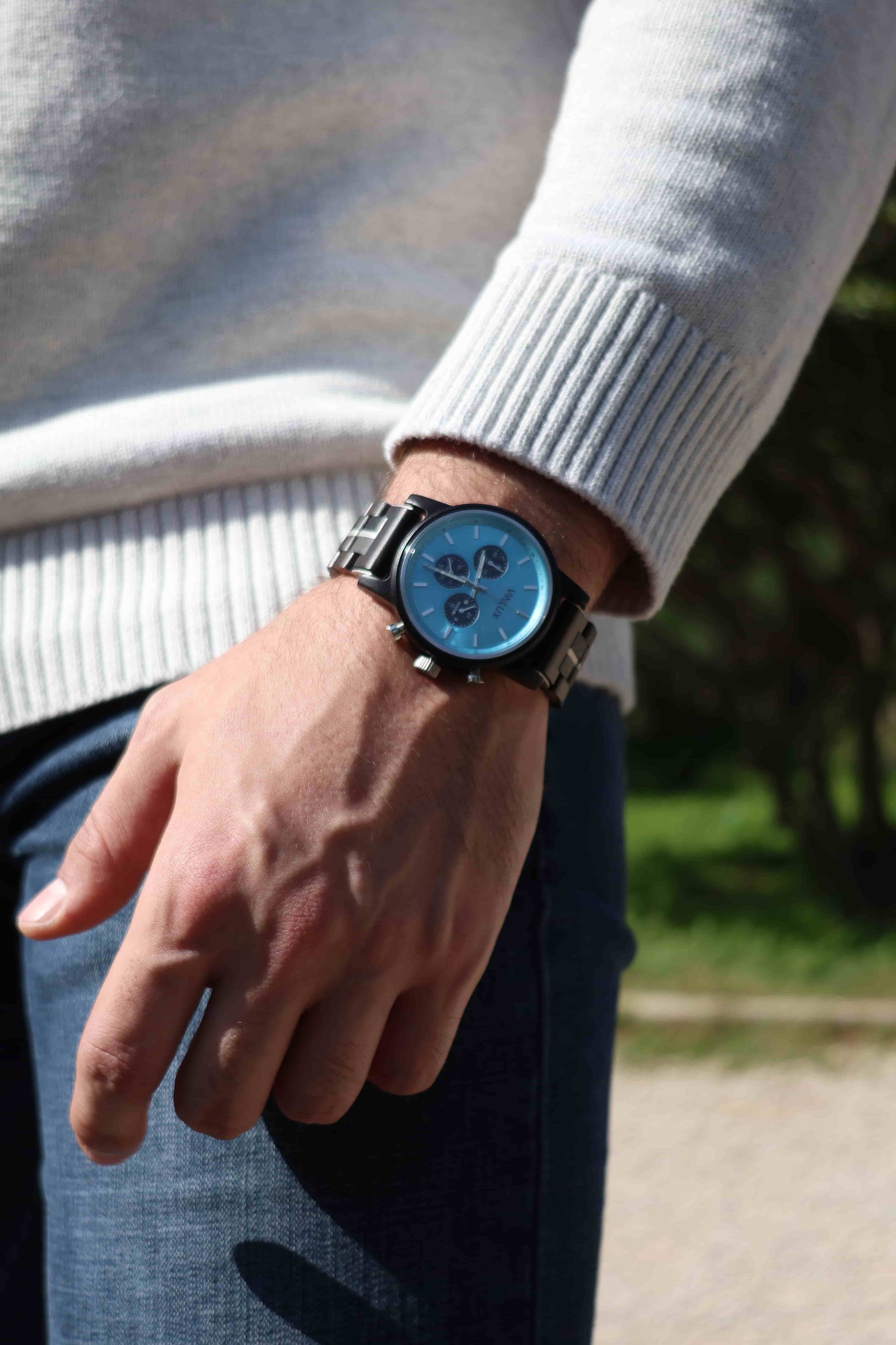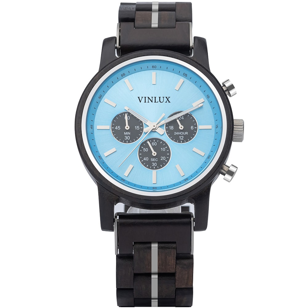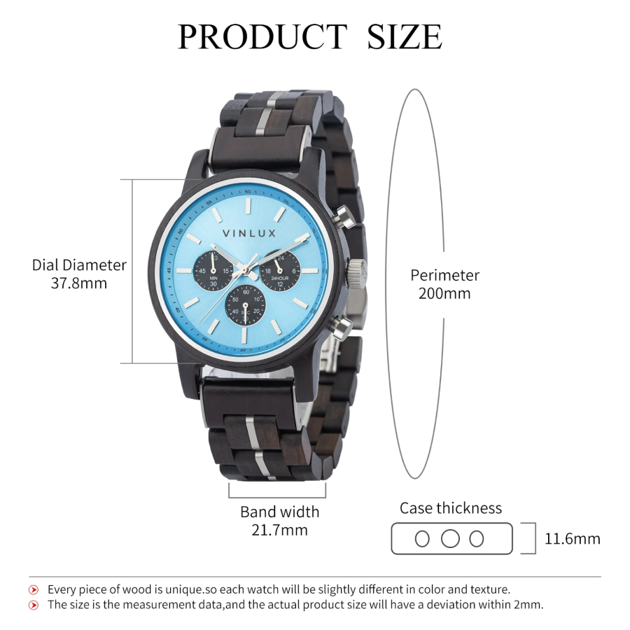 Adapting effortlessly to any occasion, the "Midnight Ocean" watch guarantees impeccable accuracy, whether paired with a formal suit or enhancing a wedding ceremony. Made from dark Ebony wood, this piece is distinguished by its deep, lustrous black color and a smooth, fine texture that polishes to a high gloss, giving it an elegant appearance. The deep blue dial mirrors the endless depths of the ocean, adding a touch of mystery and allure.