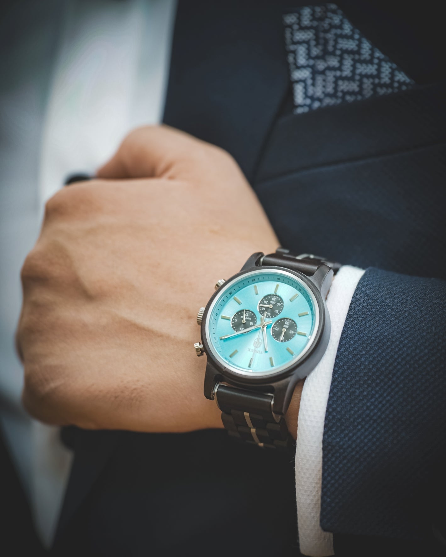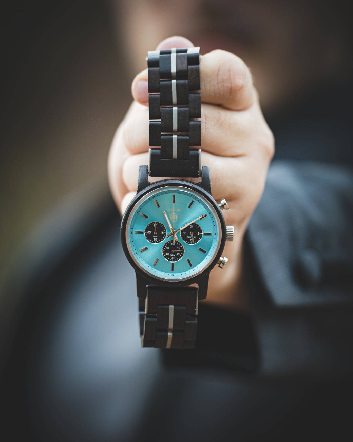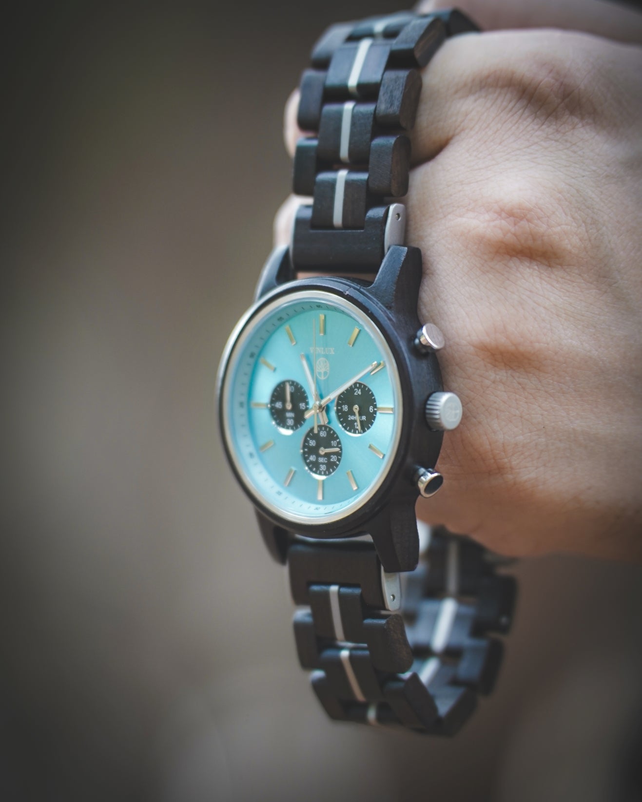 Adapting effortlessly to any occasion, the "Midnight Ocean" watch guarantees impeccable accuracy, whether paired with a formal suit or enhancing a wedding ceremony. Made from dark Ebony wood, this piece is distinguished by its deep, lustrous black color and a smooth, fine texture that polishes to a high gloss, giving it an elegant appearance. The deep blue dial mirrors the endless depths of the ocean, adding a touch of mystery and allure.